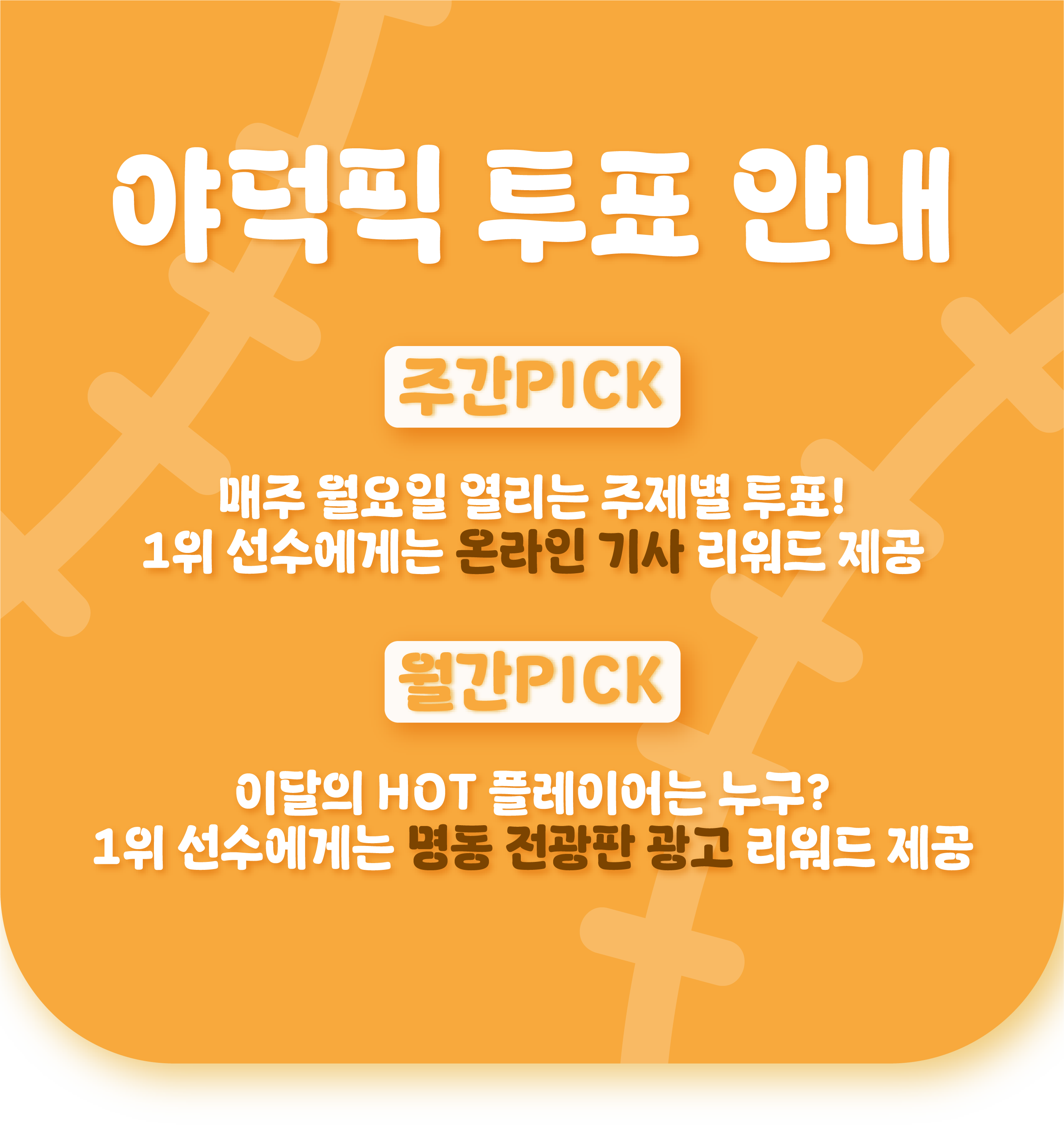 [명동 전광판 광고 진행] 10/1부터 진행된 월간픽 W1~W4 투표의 총 득표 수를 합산하여 최종 1위를 선발합니다. 현재 합산 순위 (10/23 11:00 기준) 1위 : 리베라토 4,094 2위 : 김영웅 2,280 3위 : 김민성 1,855 4위 : 안현민 1,320 5위 : 구창모 611 6위 : 박찬호 557 7위 : 원태인 360 8위 : 최형우 246 9위 : 배찬승 200 10위 : 오스틴 141